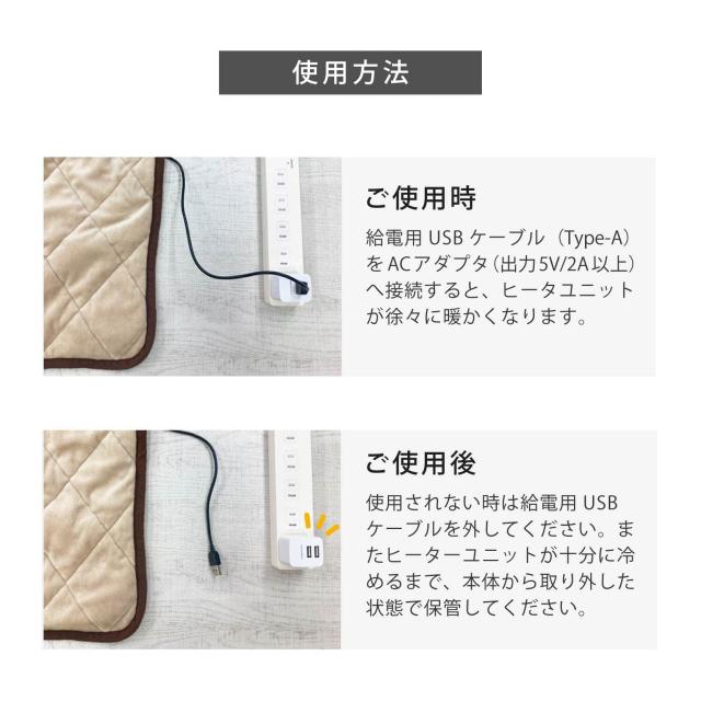USBケーブルを挿すだけの簡単仕様なので、電気ブランケットとしてどなたでもお使いいただけます。