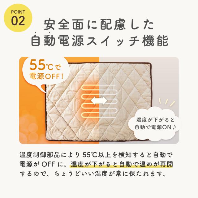 安全面に配慮した自動電源オフ機能付きで、55℃以上になると電源がオフになり、温度が下がると温めを再開します。