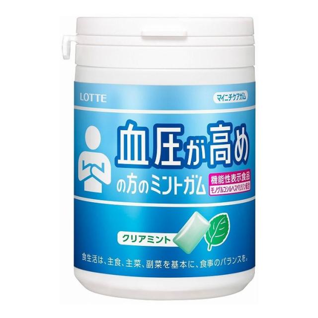 マイニチケアガム(血圧が高めの方のミントガム)スリムボトルタイプです。マイニチケアシリーズからモノグルコシルヘスペリジン配合の血圧高めの方のミントガム登場。血圧が高めの方が毎日食べても飽きがこない定番のクリアミントに仕上げています。ガムなので、場所や時間等も制限されずにリフレッシュ感覚でいつでもどこでもおいしく食べることができる血圧が高めの方に適したミントガムとなっています。