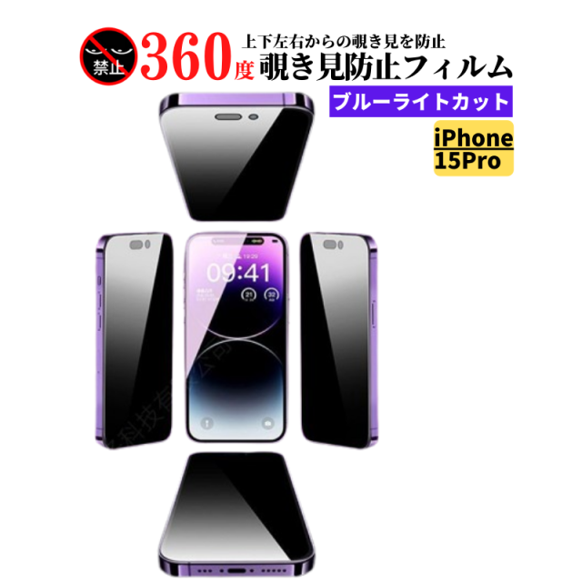iPhone 15Pro 360度 覗き見防止 ブルーライトカット 強化ガラス フィルム 保護フィルム ガラスフィルム 光沢 指紋防止 飛散防止 硬度9H 自動吸着 耐衝撃 全面保護 iPhone15Pro 15プロ