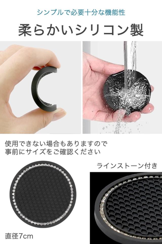 車内 ドリンク コースター 黒 キラキラ 2枚セット 直径7cm シリコン ノンスリップ カップマット 滑り止め 丸型 ラインストーン デザイン ドリンクホルダー カタカタ音 振動防止 マット 汚れ対策 弾力 水洗い 自動車 マット かわいい