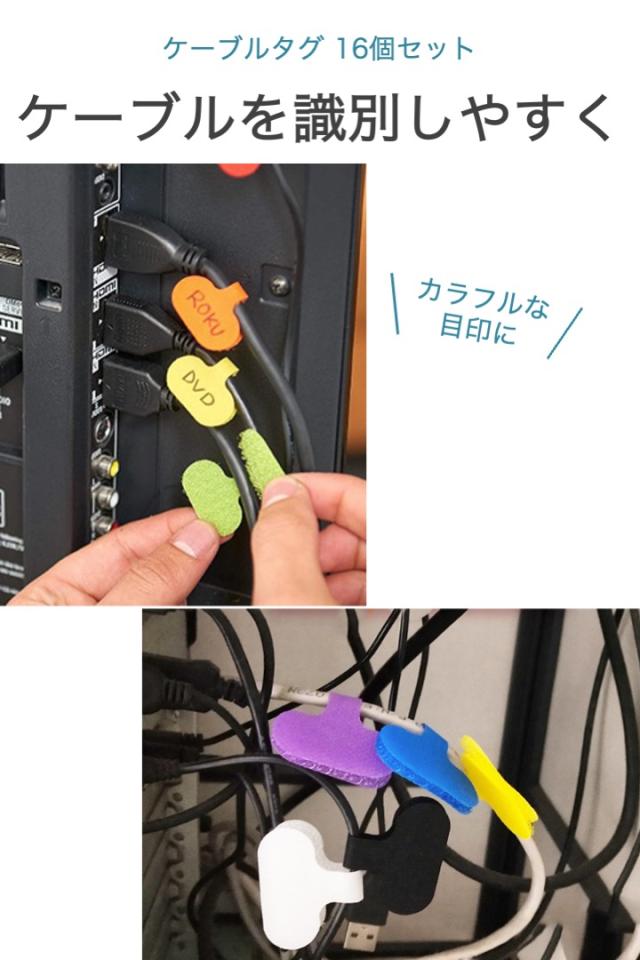 ケーブルタグ 16個セット ケーブルラベル 目印 配線整理 書き込み 可能 ケーブルタイ 目立つ 見つけやすい マジックテープ ラベル タグ 電源 LAN 充電 カラフル 8色 便利 種類分け ラベリング マジック 手書き シンプル 簡単