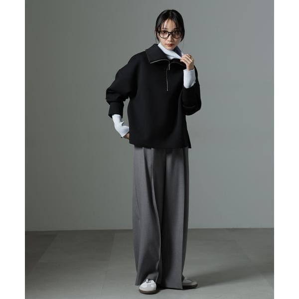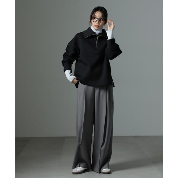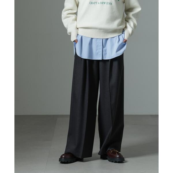カジュアルにも着こなしやすいワイドパンツ。ピックタックで縦ラインを入れたきちんと感あるルックスながらも、ウエストはゴムとスピンドルのイージ仕様で穿き心地がとても良いアイテムです。