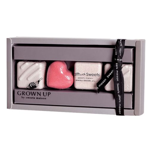 ニュアンスカラーが大人っぽい印象を与えてくれる入浴料が入ったギフトボックス。高級感あふれるボックスに、まるで本物のチョコレートのような入浴料を詰め込みました