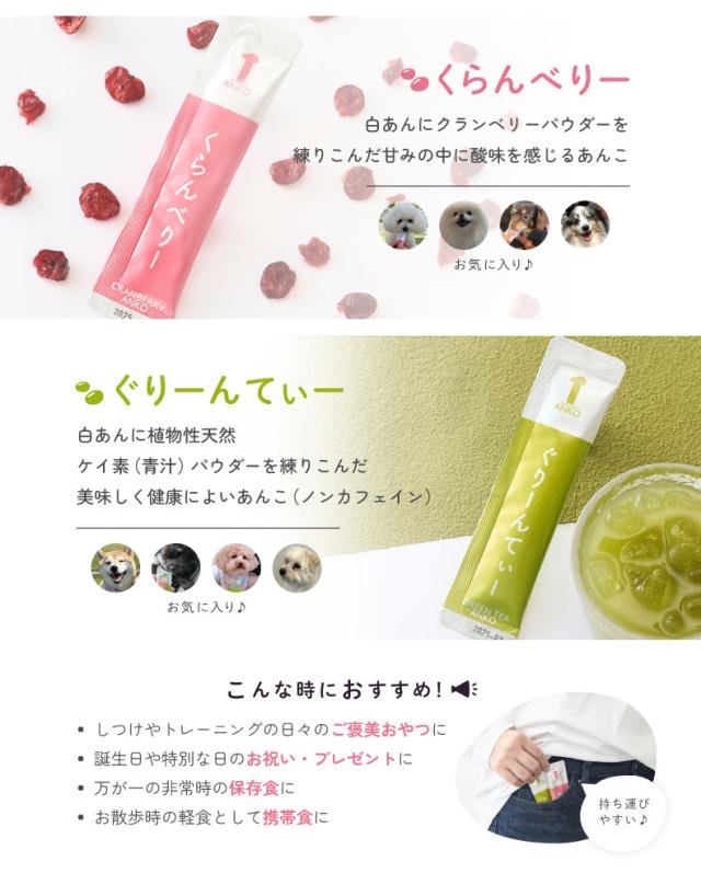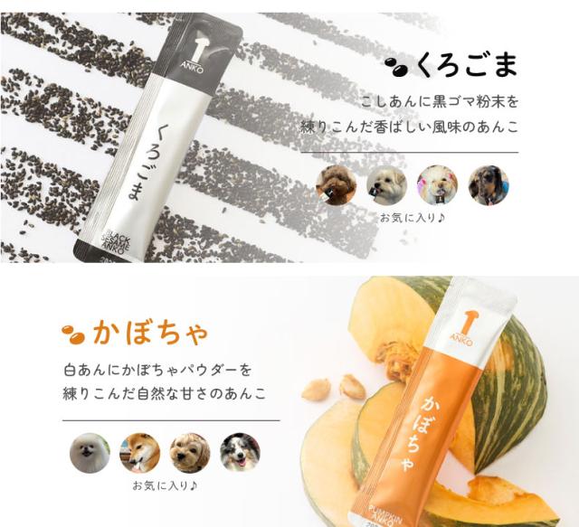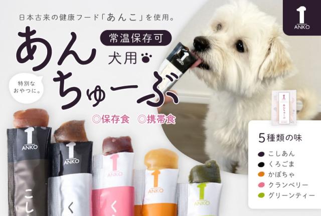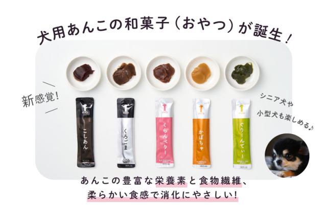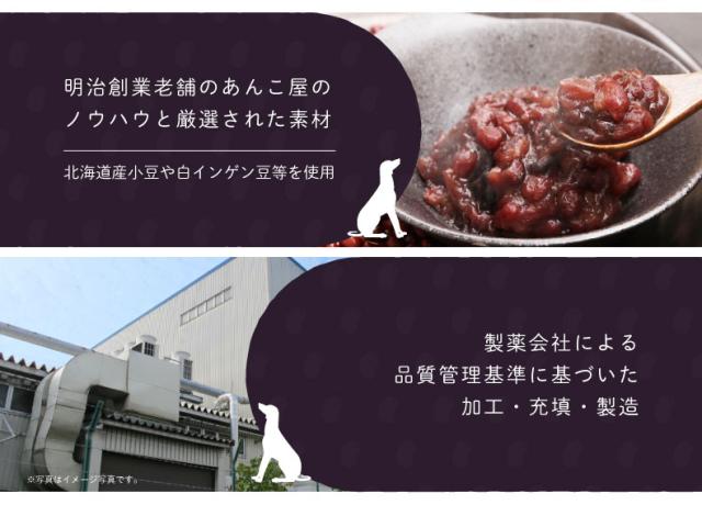 日本古来の健康フード「あんこ」を使用、ワンコの健康とおいしさを追求したワンコのおやつです。シニア犬や小型犬でも食べやすいペースト状の新感覚和菓子です。