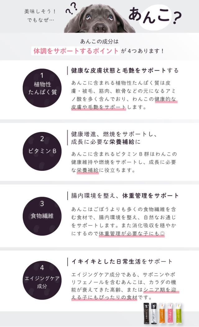 あんこはごぼうよりも多くの食物繊維を含む食材で、腸内環境を整え、自然なお通じをサポートします。また消化吸収を穏やかにするので体重管理が必要な子にも◎