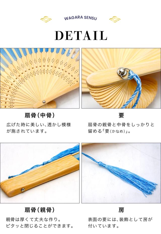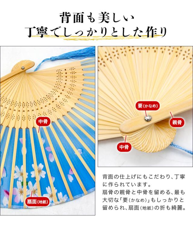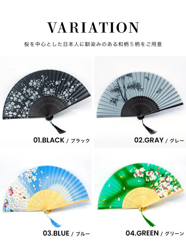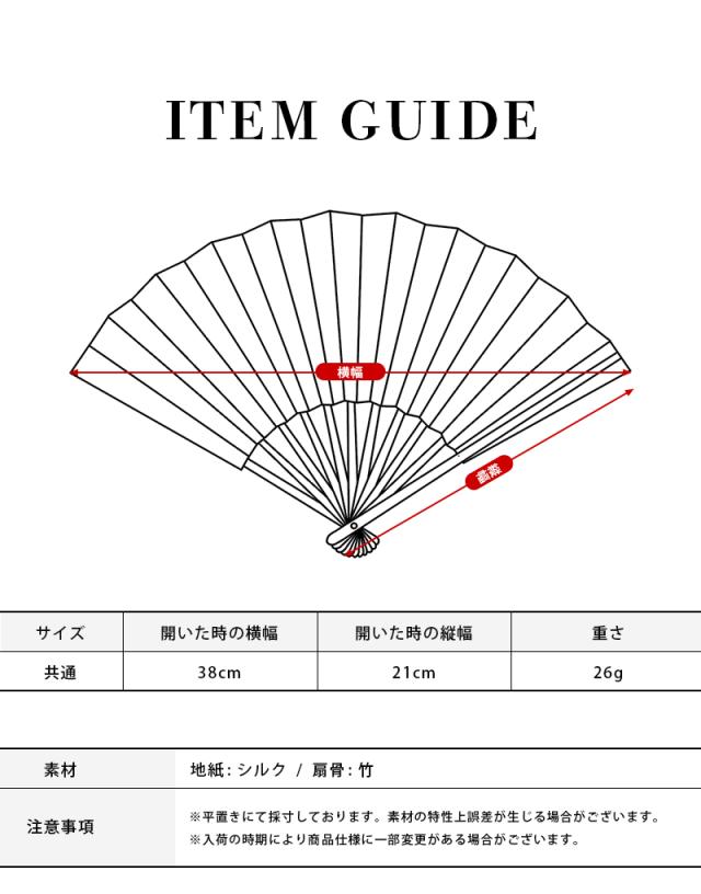 | 商品詳細 | 〇カラー:ブラック/グレー/ブルー/グリーン/ピンク 〇サイズ:38cm×21cm 〇素材:地紙/シルク、扇骨/竹 |