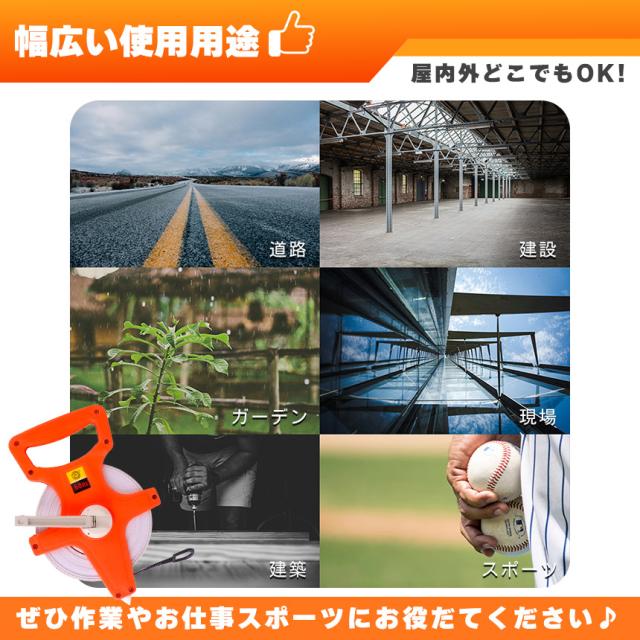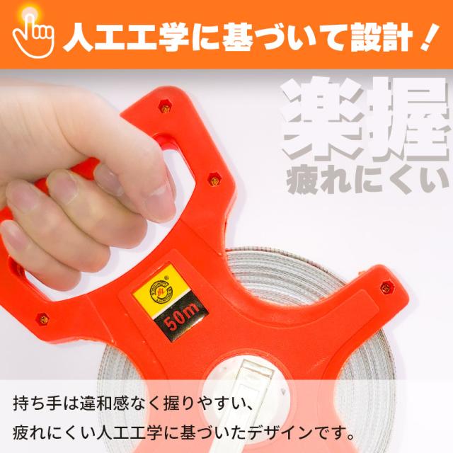 ●50m巻尺はこれで決まり!●持ちやすくスムーズリール!【人口工学ハンドル】とっても持ちやすく、長時間でも疲れにくい設計となっています。【巻きやすい】リールも巻きやすく、空転しにくくなっています。スチール強化のクランクで、反対に倒せばロックするのも簡単で便利!