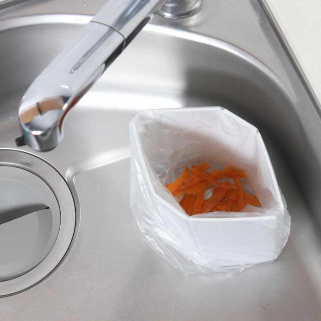 アイラップを立ててセットして使えるので野菜等の具材を混ぜ合わせたり調味料を加えたり、ボウル替わりに使えます。三角コーナーとして野菜の皮むきにも便利です。間口も広いので皮が飛び散る心配もありません。