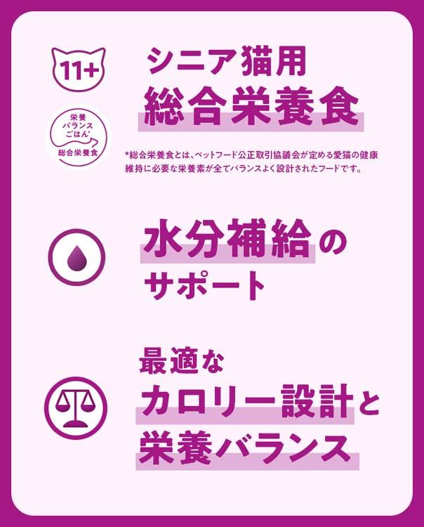 | 魚介類(かつお、さば、まぐろ等)、肉類(チキン、ビーフ等)、植物性油脂、穀類、フィッシュオイル(オメガ3脂肪酸源)、調味料(アミノ酸等)、ビタミン類(B1、B2、B6、B12、C、E、K、コリン、ナイアシン、パントテン酸、ビオチン、葉酸)、ミネラル類(Ca、Cl、Cu、Fe、I、K、Mg、Mn、Na、Zn)、アミノ酸類(タウリン)、増粘多糖類、ポリリン酸Na、EDTA-Na、発色剤(亜硝酸Na) |