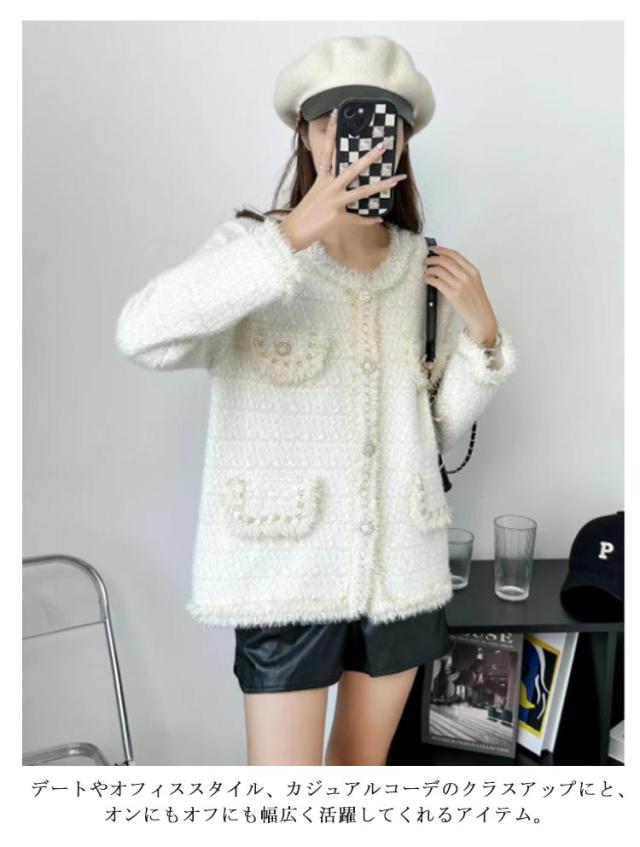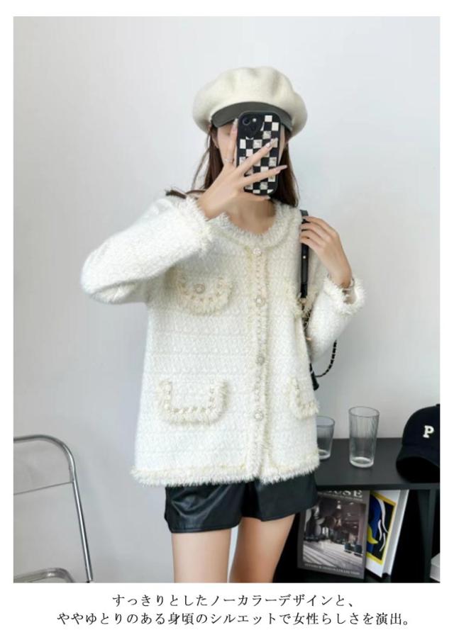 | 大人上品なノーカラージャケット。 すっきりとしたノーカラーデザインと、ややゆとりのある身頃のシルエットで女性らしさを演出。 もこもこのニット素材で柔らかく肌触りも優しい。 デートやオフィススタイル、カジュアルコーデのクラスアップにと、オンにもオフにも幅広く活躍してくれるアイテム。 | |