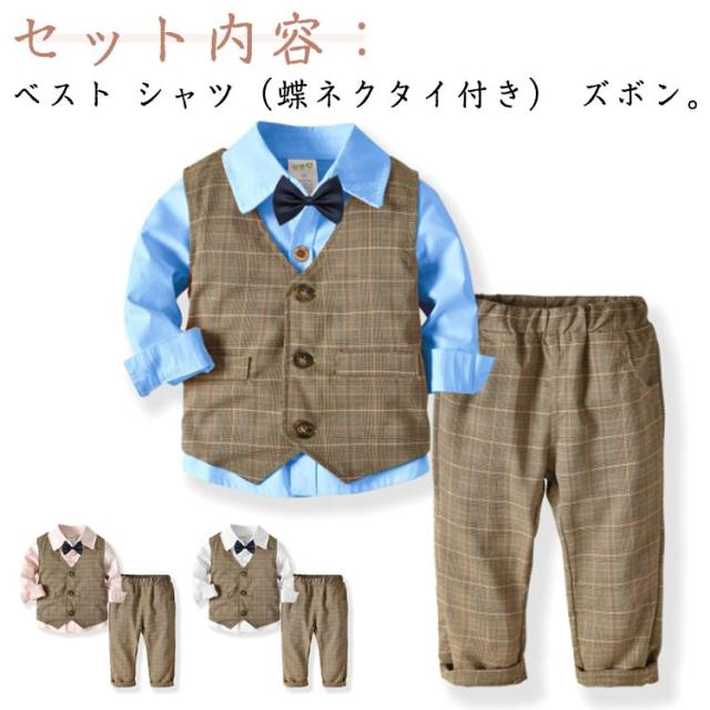 フォーマル 男の子 スーツ 卒園式 キッズ スーツ ベビー服 子供服 蝶ネクタイ付き ブレザー シャツ/ベスト/パンツ ベビー 七五三 入園式 スーツ チェック柄 タキシード風 結婚式 お宮参り 3点セット 80 90 100 110 120