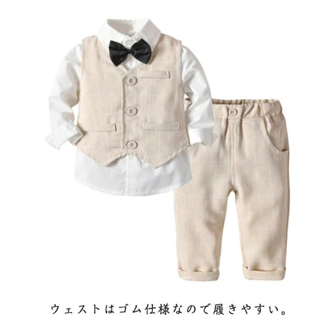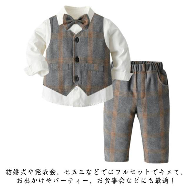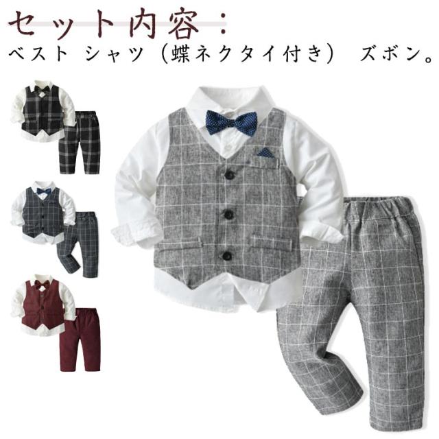 子供服 お宮参り ベビー服 蝶ネクタイ付き ブレザー 男の子 90 フォーマル ベビー シャツ/ベスト/パンツ 卒園式 入園式 七五三 キッズ スーツ チェック柄 タキシード風 結婚式 子供服 スーツ 70 80 3点セット 100 110 120