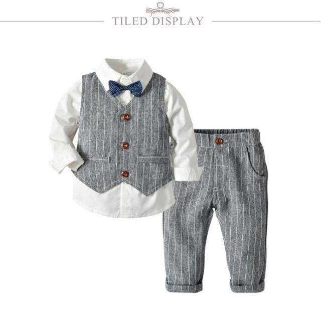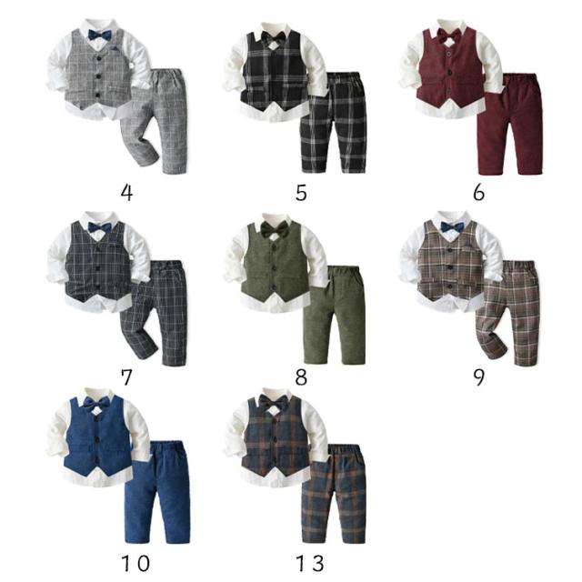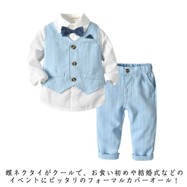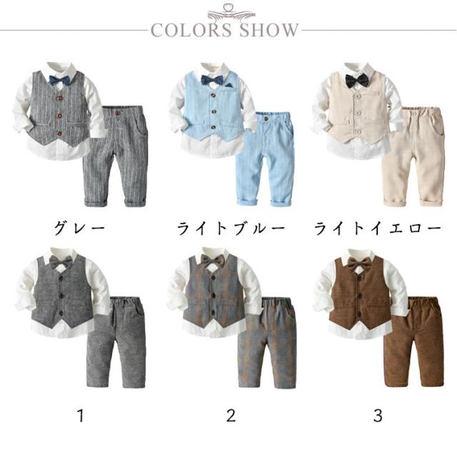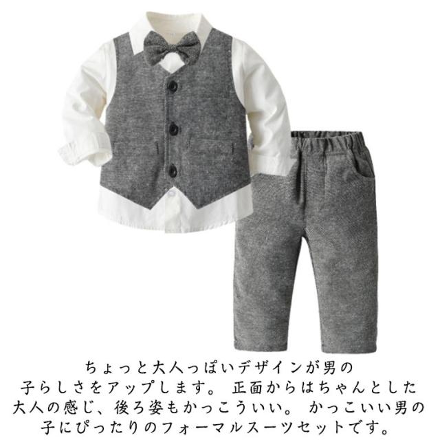 | セット内容:ベスト シャツ(蝶ネクタイ付き) ズボン。 蝶ネクタイがクールで、お食い初めや結婚式などのイベントにピッタリのフォーマルカバーオール! ウェストはゴム仕様なので履きやすい。 ちょっと大人っぽいデザインが男の子らしさをアップします。 正面からはちゃんとした大人の感じ、後ろ姿もかっこういい。 かっこいい男の子にぴったりのフォーマルスーツセットです。 結婚式や発表会、七五三などではフルセットでキメて、お出かけやパーティー、お食事会などにも最適! 家族写真、お食い初めなどの記念撮影にもインスタ映えもバッチリ。出産祝い、誕生日、お孫さんのプレゼントなどにも喜ばれます。 | |
