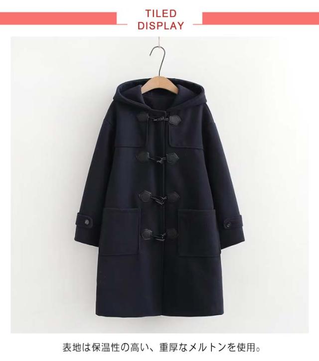 | シンプルなデザインの定番ロングダッフルコートです。 表地は保温性の高い、重厚なメルトンを使用。 中綿が入った保温性のあるキルト裏地を使用しているため、寒い冬でも大活躍。 ブレザーやセーラー服の上に着用しても窮屈感のないサイズ感がポイントです。 | |