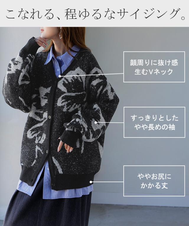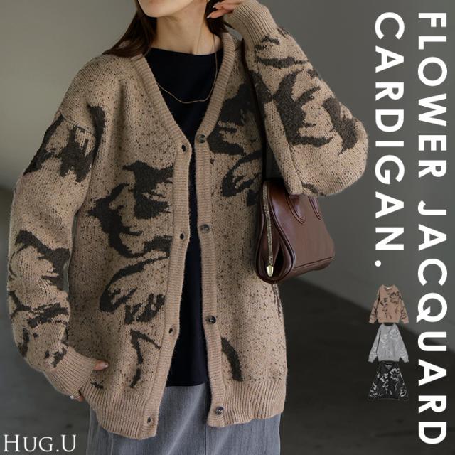 【冬SALE】 カーディガン 花柄 ニット レディース セーター カーデ トップス ロング オーバー ニットカーディガン ジャガード 柄 チクチクしない 長袖 羽織 Vネック ゆったり オーバーサイズ 体型カバー お尻が隠れる カジュアル ストレッチ 黒 秋 冬 HUG.U 秋新作