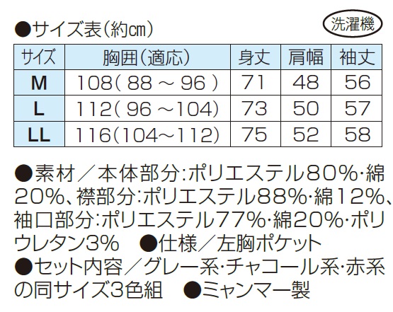 ●素材/本体部分:ポリエステル80%・綿20%、襟部分:ポリエステル88%・綿12%、袖口部分:ポリエステル77%・綿20%・ポリウレタン3%