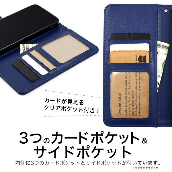 衝撃やキズなどから守ります。 また、内部はソフトケースなので着脱が簡単です。 背面を折り返すとスタンドとして使用できるので、動画視聴に便利です。 落下防止に最適なストラップとストラップホール付きです。 横開きタイプなので、手帳のように使うことができます。 また、内側に3つのカードポケットとサイドポケットが付いています。 | ||||||||||||||