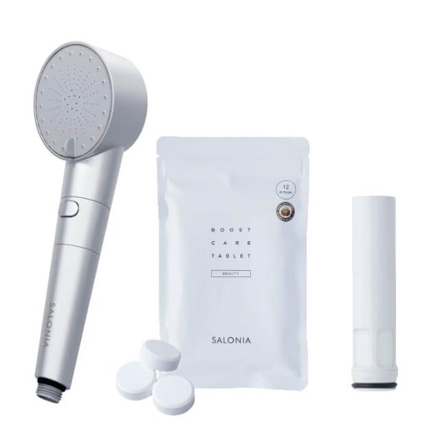| 【ファインバブルクリア セット】 ファインバブルクリア本体 ブーストケアタブレット(重炭酸タブレット)6錠 クリアケアカートリッジ(塩素除去カートリッジ)のセット。 |