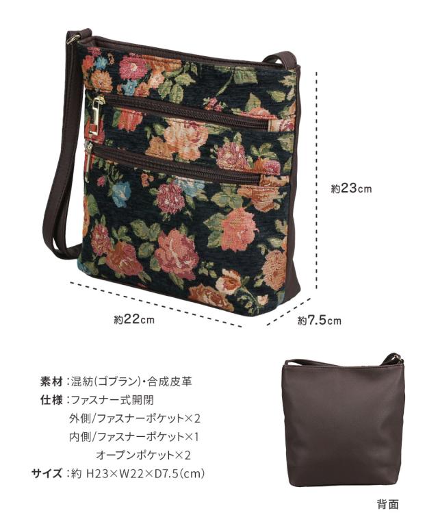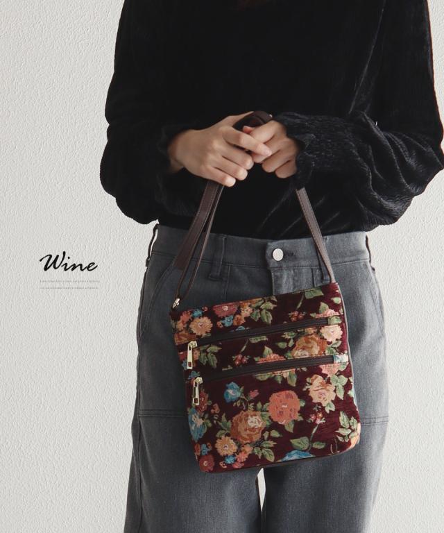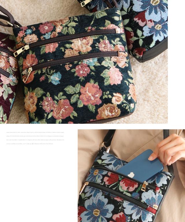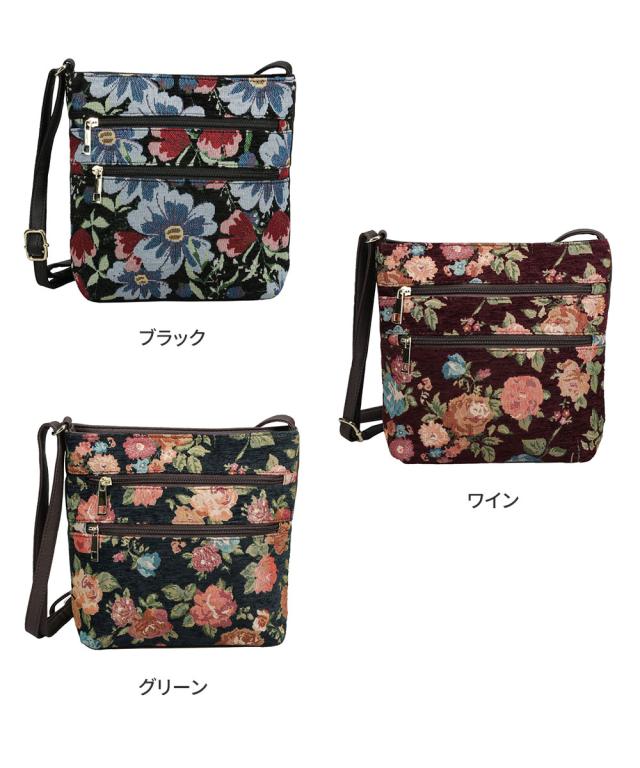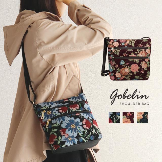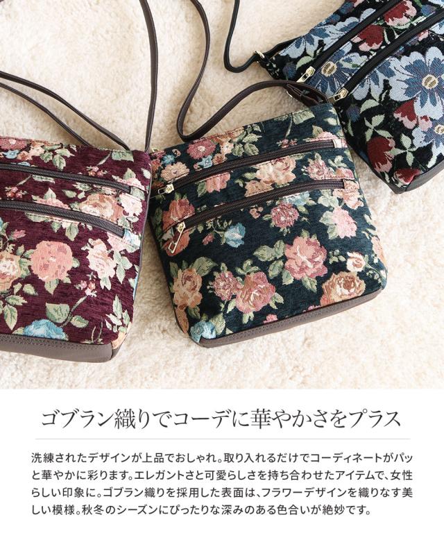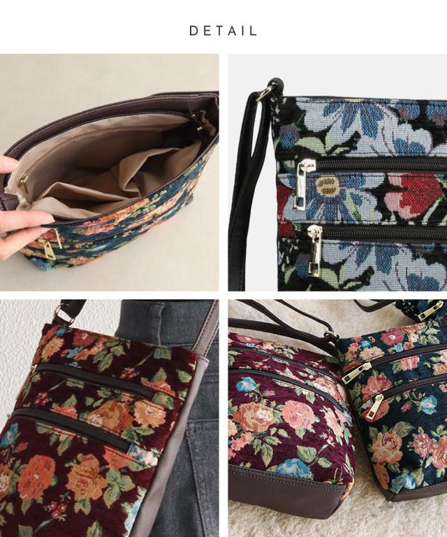 ショルダーバッグ レディース 斜めがけ 大人 上品 ゴブラン織り バッグ ファスナー カジュアル おしゃれ エレガント かわいい ツートン 2way 斜め掛け 斜めがけ 旅行 秋 冬 婦人 女性物 花柄 フラワー ツートン 鞄 カバン GOBELIN BAG 黒 ブラック グリーン ワイン