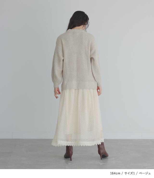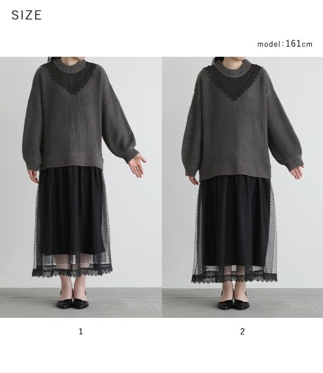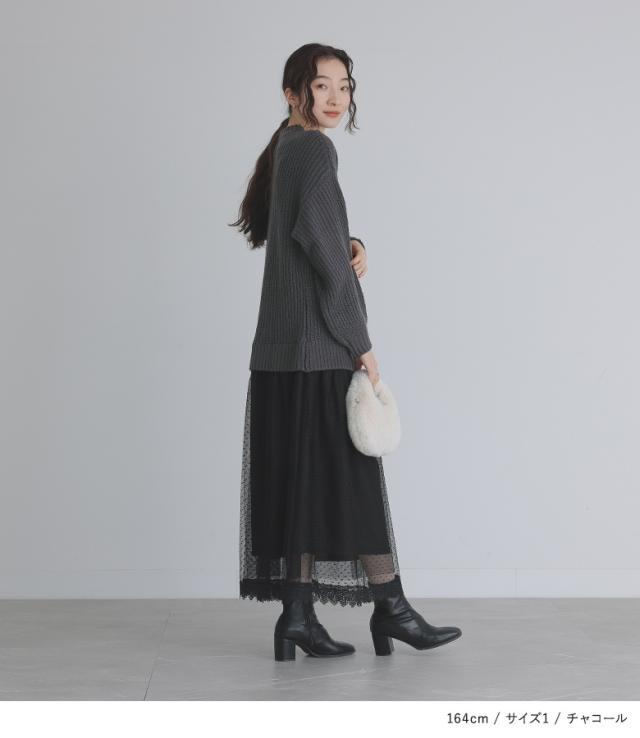 ■デザイン ニットトップスにチュールスカートをドッキングしたワンピース。1枚でコーディネートが完成する、着こなしに迷わずお洒落見えする嬉しいアイテムです。トップス部分にはスカートと同じドット柄チュール生地とレースを切り替えてポイントにしました。トップス部分は長めの着丈にすることでゆるっとラフな印象をプラス。スカート部分はチュールを2枚重ねることでふわっとボリュームを出しました。 ■コーディネート 1枚でコーディネートが完成するワンピースは帽子やアクセサリーなど小物でアレンジを加えると、違った雰囲気で着こなしをお楽しみいただけます。足元もショートブーツからスニーカー、パンプスまで、変化をつけてご着用いただけます。 ■素材 アクリル糸を使用した暖かな着心地のニットに、柔らかな手触りのドット柄チュール生地を合わせました。 ■製品についての注意書き ニット製品につきまして。 ニット素材の持つ特性として編み上げる行程やプレス仕上げによって多少サイズや風合いの個体差が生じる場合がございます。 着用した時と実寸の長さが変わる可能性がございます。 また、着用の際ピリングが避けられず、完全に防止することはできません。毛玉取り器等で丁寧に取り除いてください。 ご了承の上、ご購入いただきますようお願いいたします。 |