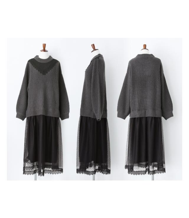 【送料無料】『チュールドッキングニットワンピース』【メール便不可】【50】[ワンピース レディース 長袖 ニット ニットワンピース ワンピ ドッキング チュール オシャレウォーカー]