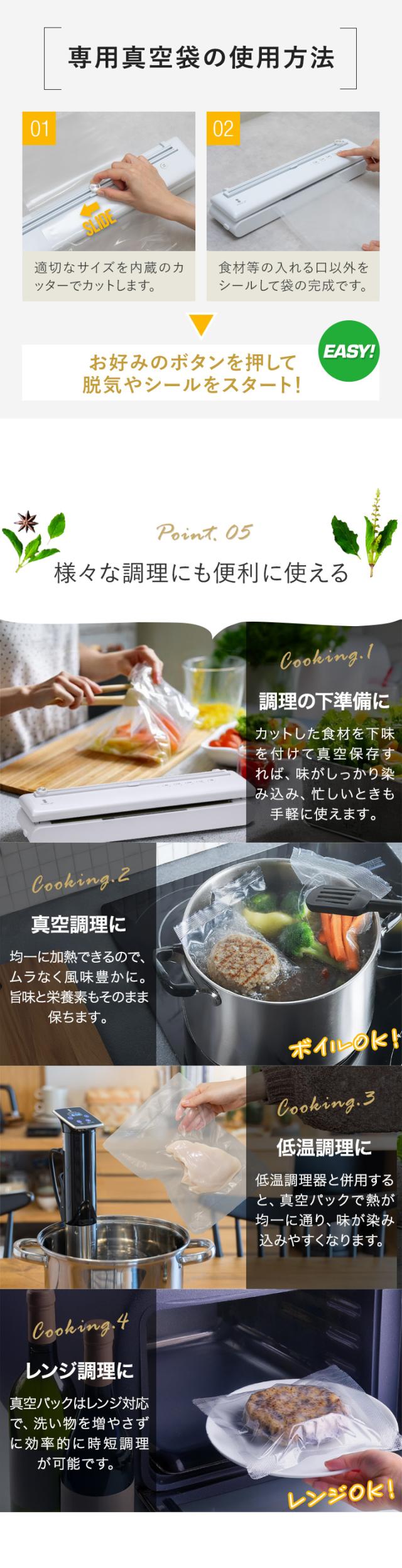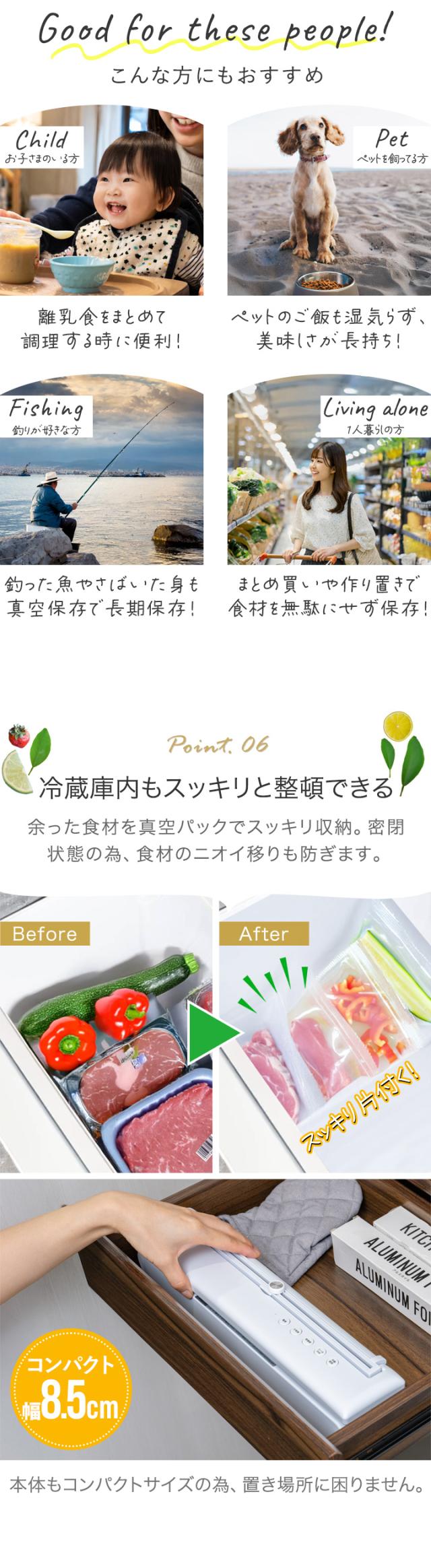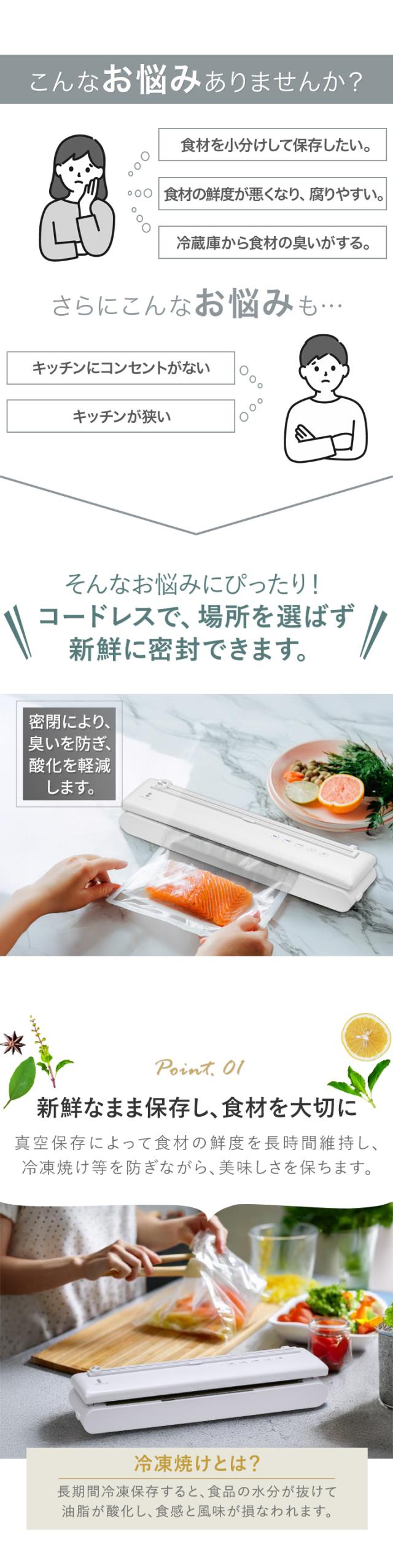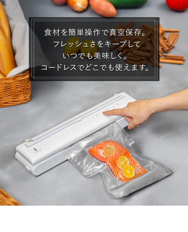 真空パック 真空パック機 真空パック器 真空包装機 真空包装 フードシーラー 業務用 家庭用 USB USB給電 USB対応 typec コードレス 充電 充電式 バッテリー バッテリー内蔵 リチウムイオン電池 50回 幅40cm 奥行8.5cm 高さ7cm -60kPa -60キロパスカル 自動脱気 吸引力 吸引 脱気力 脱気 パワフル 密閉 乾湿両用 乾きもの 汁気 汁物 汁物対応 真空調理 真空調理器 真空調理機 低温調理 低温調理器 低温調理機 鮮度 長持ち 5m ロール ロール袋 袋 食品 食材 保存 保管 冷凍 冷蔵 電子レンジ レンジ調理 湯煎 ボイル カッター付き 簡単 コンパクト 小さい 冷蔵庫 庫内 整理 整理整頓 省スペース 家電 調理家電 キッチン家電 キッチン 料理道具 便利 便利グッズ 非常用 備蓄 備え ペットフード 小分け おすそ分け 下味 下処理 お弁当 作り置き 食べかけ 食べ残し 開封済み シーリング シーラー パッキング 圧縮 飲食店 カフェ レストラン 介護施設 病院 食堂 レシピ 小物 小物収納 ビニール袋 お菓子 煮物 肉 魚 生鮮食品 米 コーヒー 出汁 煮干し ナッツ パン