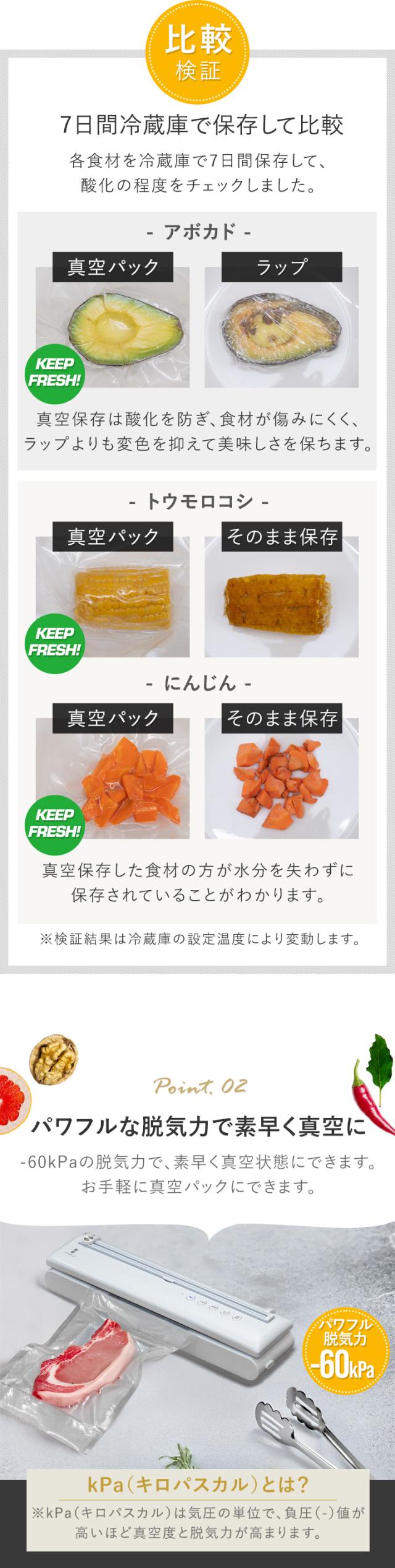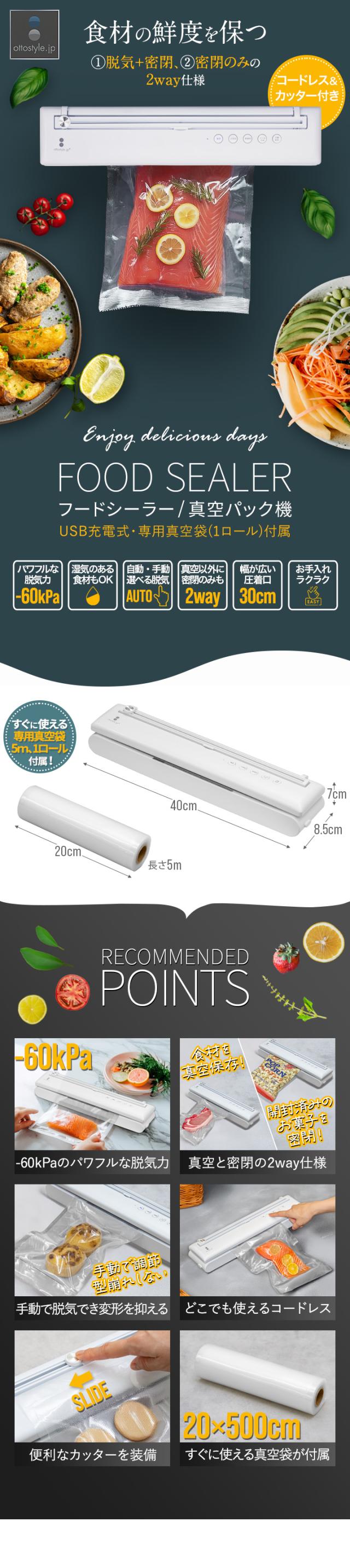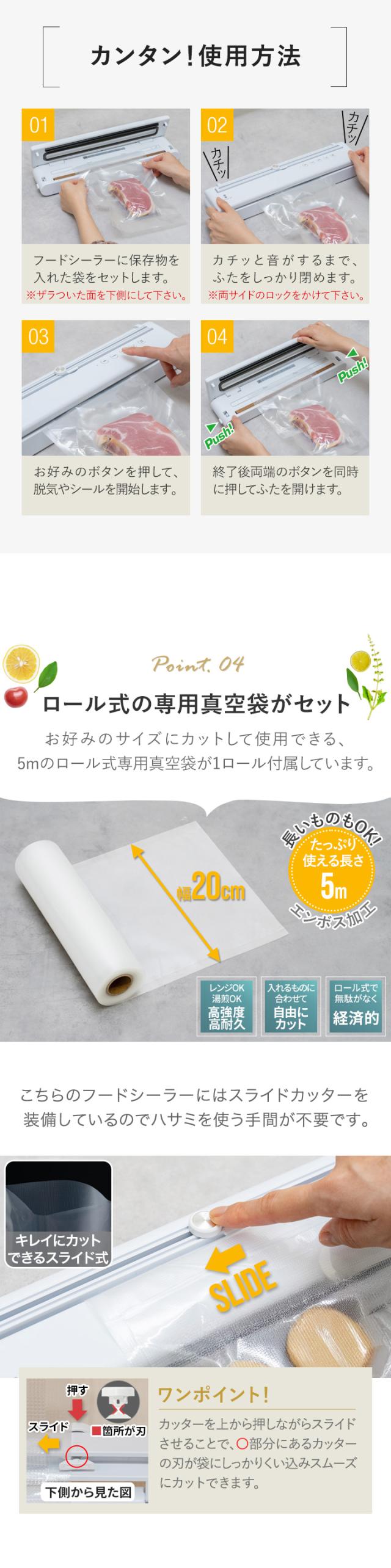 真空パック 真空パック機 真空パック器 真空包装機 真空包装 フードシーラー 業務用 家庭用 USB USB給電 USB対応 typec コードレス 充電 充電式 バッテリー バッテリー内蔵 リチウムイオン電池 50回 幅40cm 奥行8.5cm 高さ7cm -60kPa -60キロパスカル 自動脱気 吸引力 吸引 脱気力 脱気 パワフル 密閉 乾湿両用 乾きもの 汁気 汁物 汁物対応 真空調理 真空調理器 真空調理機 低温調理 低温調理器 低温調理機 鮮度 長持ち 5m ロール ロール袋 袋 食品 食材 保存 保管 冷凍 冷蔵 電子レンジ レンジ調理 湯煎 ボイル カッター付き 簡単 コンパクト 小さい 冷蔵庫 庫内 整理 整理整頓 省スペース 家電 調理家電 キッチン家電 キッチン 料理道具 便利 便利グッズ 非常用 備蓄 備え ペットフード 小分け おすそ分け 下味 下処理 お弁当 作り置き 食べかけ 食べ残し 開封済み シーリング シーラー パッキング 圧縮 飲食店 カフェ レストラン 介護施設 病院 食堂 レシピ 小物 小物収納 ビニール袋 お菓子 煮物 肉 魚 生鮮食品 米 コーヒー 出汁 煮干し ナッツ パン