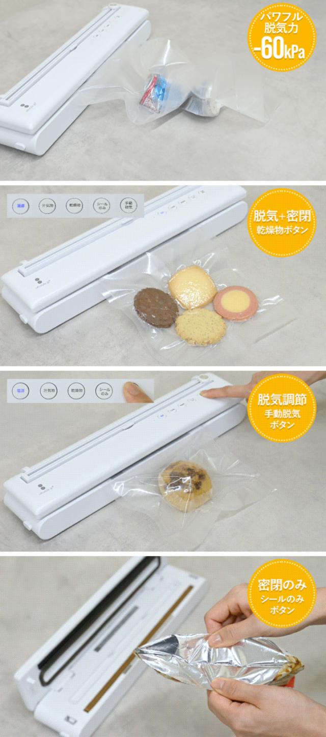 - 初めて真空パック機購入しました。とてもいい商品だと思います。ただ、商品説明にあるように専用袋不要というのはどんな袋でも使用出来るように誤認してしまうのでどのメーカーでも真空パック専用袋なら使用可能といった説明の方が親切だと思いました。(真空用のエンボス加工が重要で空気はその隙間から抜けるため) 試しによくあるジップロックのフリーザーバッグのチャック部を切断してやってみましたが全く空気は抜けません。これから購入検討される方は金額プラスでロール袋追加バージョンを購入したほうが良いと思います。絶対にバラで買うより安いので。私はどんな袋でも使用可能なら要らないかと思い後悔したので参考までに。