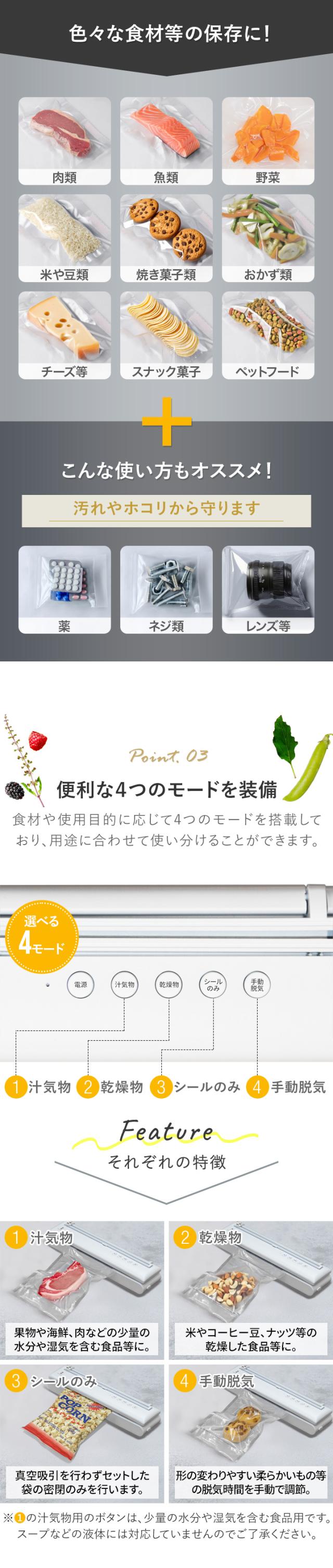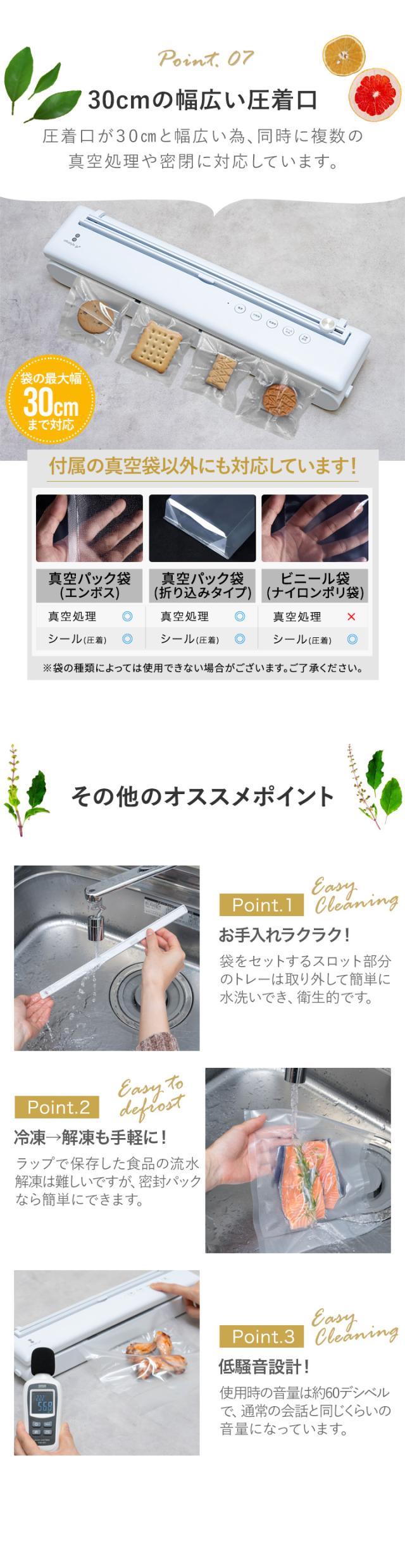| 特記事項: ※文中の「真空」は完全な真空状態のことではありません。JIS規格における「大気圧より低い圧力の気体で満たされた空間内の状態」です。 ※使用しないときはふたを完全に閉めてロックしないでください。長時間ロックした状態で放置するとシールスポンジが変形し、機体のポンプ効果に影響を与えるおそれがあります。 ※本機には防水機能はありません。使用時や清掃時に水分が機体内に入らないようにしてください。 ※充電ランプが赤く点滅し始めたら、バッテリーが切れる前に本機を充電してください。使用中にバッテリーが切れると動作を停止、中断します。 ※火傷を避けるため、使用直後はシールヒーターに絶対に触れないでください。 ※水分や汁気を含む食品を真空包装する場合は、湿式真空シールのみを使用してください。液体が本体内部に浸入して機械や部品が損傷したり故障しないように十分に注意してください。 ※水分を含む食品(肉、魚など)に使用する場合は、袋の口を濡らすと密閉しにくくなりますので真空包装する前にタオルで水分を拭き取るか、袋に包んでください。 ※袋の口を清潔に保ち、まっすぐな状態にしてセットしてください。 ※真空にする際は袋にしわが寄らないようにし、硬いものが袋に刺さらないようにしてください。 ※真空する際にあらかじめ袋内に空気が入りすぎないように注意してください。 ※袋を軽く押して中の空気を排出することで真空時間を短縮し、包装効率を向上させることができます。 ※真空する際にうまく空気を吸引できない場合は、真空袋が漏れていたり穴があいていないか、誤った状態で機械にセットしていないか確認してください。 ※骨や魚、トゲのある食品など、鋭利な突起のある食品の場合は、袋を突き刺さないように先端をティッシュなどで包んで使用してください。 ※シール後は20秒ほど経ってから再度シール補強することをお勧めします。 ※厚手の真空袋をシールする際、密封性が不十分の場合はもう一度シールすることをお勧めします。 ※袋のシールが溶けて圧着できない場合、シールヒーターが非常に高温になり過ぎている可能性があります。その場合は真空シールをする前に数分間冷却してから再使用してください。 ※本製品を使用する際は、お子様が本機に触れないように目を離さないてください。この製品をおもちゃとして使用させないでください。 ※真空にする際はスープなどの水分が多いもの、とろみのあるものは使用しないでください。 ※粉と水分が分離したものの同時脱気処理は避けてください。空気と一緒に水分、粉も吸い上げてしまい本体が故障するおそれがあります。 |
