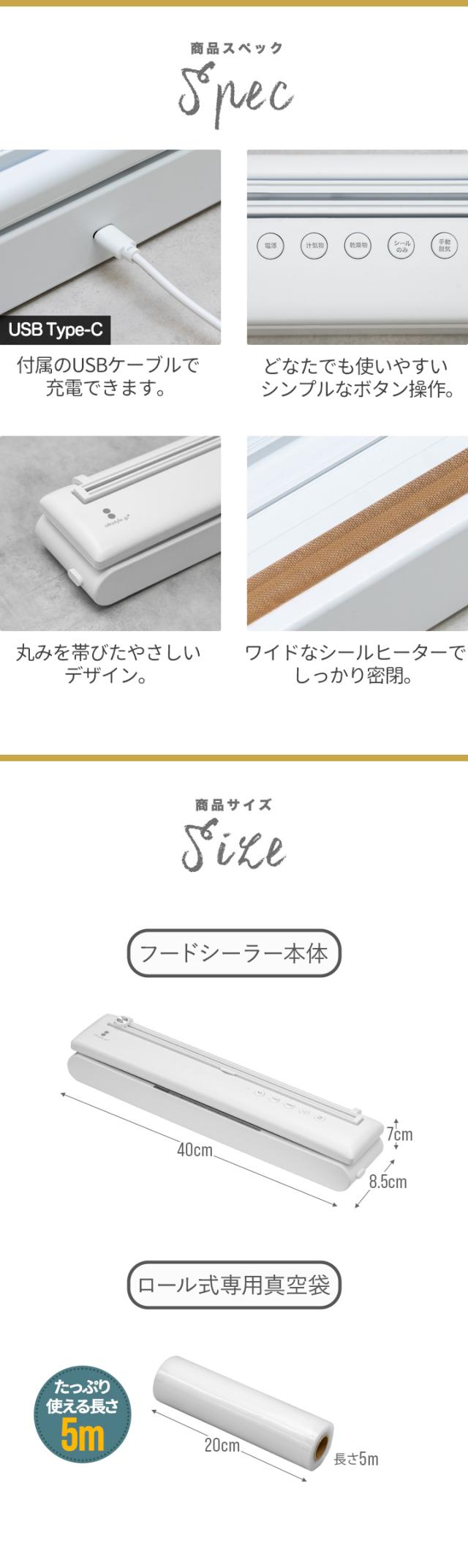 | サイズ: ・フードシーラー本体 : (約)幅40cm×奥行8.5cm×高さ7cm ・USB Type-Cケーブル : (約)長さ100cm ・ロール式専用真空袋 : (約)幅20cm×長さ5m |