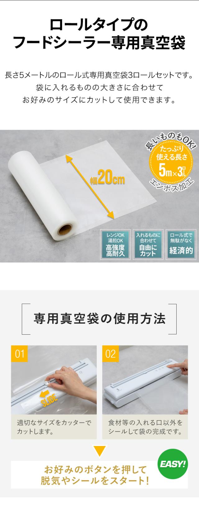 真空パック機 真空パック器 フードシーラー 専用ロール袋 3ロールセット 幅20cm×長さ5m エンボス ロール 真空パック袋 袋 電子レンジ 湯煎 業務用 家庭用 真空包装機 冷凍 小分け 食品 食材 ※袋のみ 本体別売 保存 1年保証 送料無料