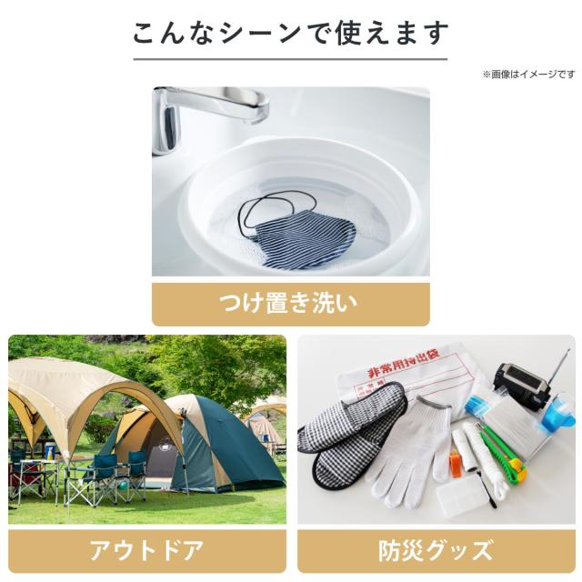 子供の衣類や小物のつけ置き洗いなど、ちょっとした時にバケツ代わりとしてお使いいただけます。また、持ち運びしやすいためアウトドアや防災グッズのアイテムとしても活用できます。