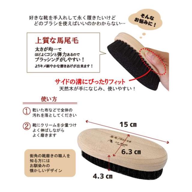 おしゃれの基本は足元から。。ブラシに使用している上質な馬尾毛は太さが均一でほどよくコシと弾力があるため、ブラッシングがしやすくよりキメ細やかな磨きあげができ、革靴に味が出てきます。フォルムは伝統の楕円(オーバル)形状、街角の靴磨きの職人を知る方にはお馴染みの懐かしいデザインです。「好きな靴を手入れして長く履きたいが、どのブラシを使えばよいのかわからない」と悩んでいる方にお勧めです。