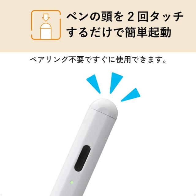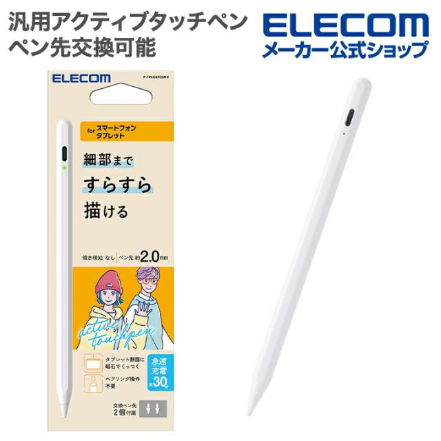 汎用 アクティブ タッチペン スタイラス リチウム充電式 磁気吸着 USB-C充電 急速充電 ペン先交換可能 ペン先付属2個 ホワイト┃P-TPACST05WH