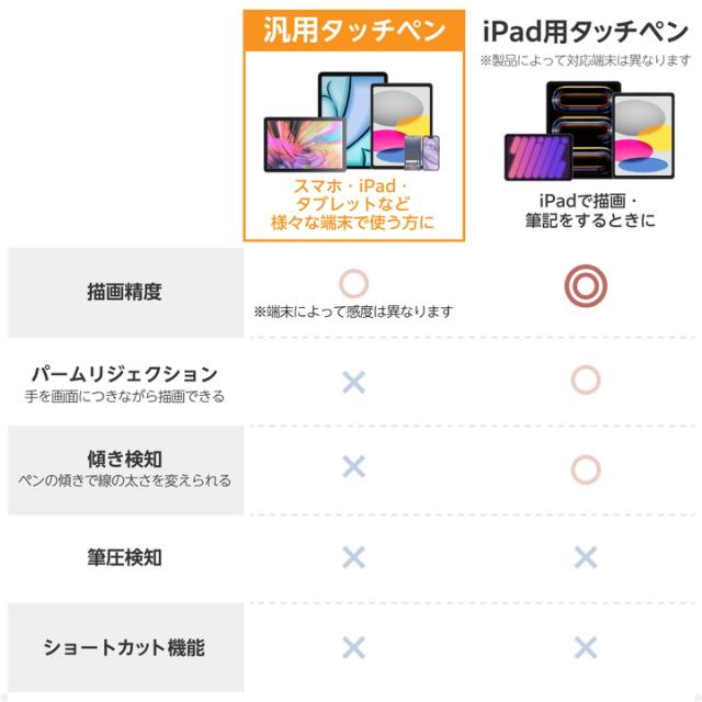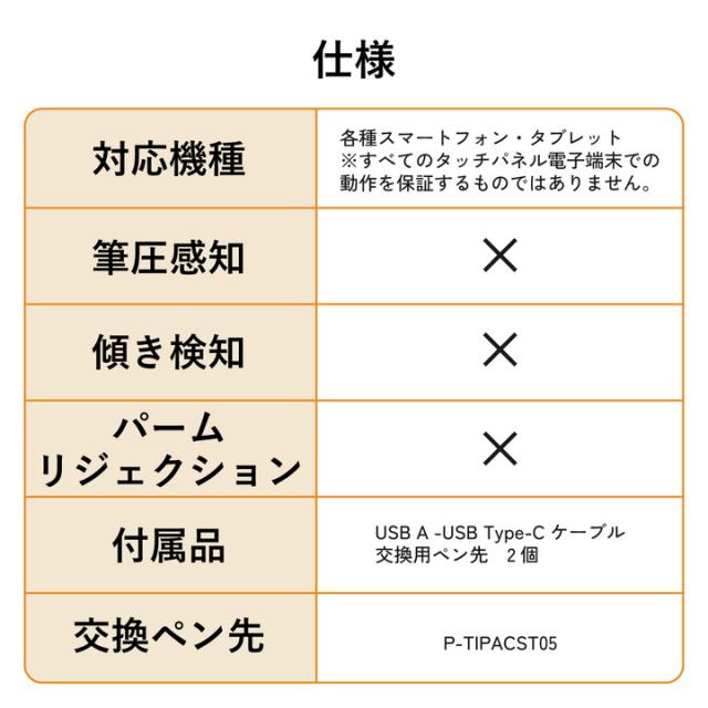 隙間時間の充電ですぐに使える!約30分でフル充電可能な急速充電機能を搭載した、汎用アクティブタッチペンです。約2.0mmのペン先で細かい作業、メモや絵を描くのにおすすめ。ペン先は導電性に優れたポリアセタール樹脂(POM)を採用し、滑らかな描き心地で画面を傷つけにくいです。![]() ■幅広いスマートフォン・タブレットに対応したアクティブタッチペンです。 ■※すべてのタッチパネル電子端末での動作を保証するものではありません。 ■約30分でフル充電可能な急速充電機能を搭載。電池が切れても充電してからすぐに使用できます。 ■約2.0mmのペン先で細かい作業、メモや絵を描くのにおすすめです。 ■ペン先は導電性に優れたポリアセタール樹脂(POM)を採用し、滑らかな描き心地で画面を傷つけにくいです。 ■タッチペンの側面にはマグネット面があり、タブレットに吸着ができるので紛失を防ぎます。 ■※すべてのタブレットに対応するわけではありません。 ■※タブレットに装着するケースによってはタブレット本体の磁石部分が隠れてしまい、本製品を付けられない場合があります。 ■マグネット面がフラットになっていて、テーブルや床に置いても転がりにくい形状です。 ■USB Type-C(TM)ケーブルで充電が可能で、約7時間の連続使用が可能です。 ■※ご使用状態によっては、目安の時間よりも早く充電が必要になる場合があります。 ■ペアリングが不要で、電源をオンにするだけですぐに使用できます。 ■操作しない状態が5分間続くとオートオフ機能が働き、電源がオフになるので消し忘れを防ぎます。 ■指先でのタッチ操作と違い、画面を汚さずに操作可能です。 ■タッチ操作はもちろん、スライド・スワイプ操作も快適に行えます。 ■※画面保護フィルムをご使用の際は、タッチペンの跡が残る恐れがあります。 ■※画面保護フィルムをご使用の際は、フィルムの種類によっては、操作時にこすれ音が生じたり、ペンの反応が悪くなることがあります。 ■交換用のペン先を2個と、USB Type-Cケーブルを付属しています。 ■※本製品にACアダプター(AC充電器など)は付属していないため、出力5V/500mA以上のUSB出力アダプターを別途ご用意ください。 ■※USB Type-C and USB-C are trademarks of USB Implementers Forum ![]() ■対応機種:各種スマートフォン・タブレット ※全てのタッチパネル電子端末での動作を保証するものではありません。 ■外形寸法:全長:約166mm、直径:約8.8mm、ペン先:約2.0mm ■材質:ペン先:ポリアセタール樹脂(POM)、本体:アルミニウム・マグネット ■カラー:ホワイト ■質量:約14g ■電池:リチウムイオン電池 ■使用時間:約7時間 ※ご使用状態によっては、目安の時間よりも早く充電が必要になる場合があります。 ■充電時間:約30分 ※使用状況や環境により変化します。 ■保証期間:1年間 ■付属品:USB-A - USB Type-C(TM)ケーブル、交換用ペン先2個 ■筆圧感知:× ■ワイヤレス充電:× ■傾き検知:× ■パームリジェクション:× ※画面に手をついた状態では描画できません。 ■備考:※特定のアプリやソフトにおいて、専用タッチペンのみでの描写設定をしている場合は使用できないことがあります。 |