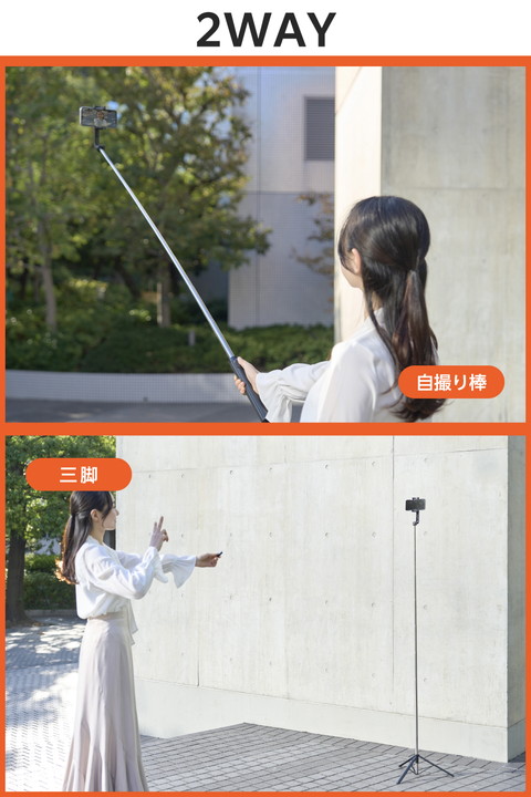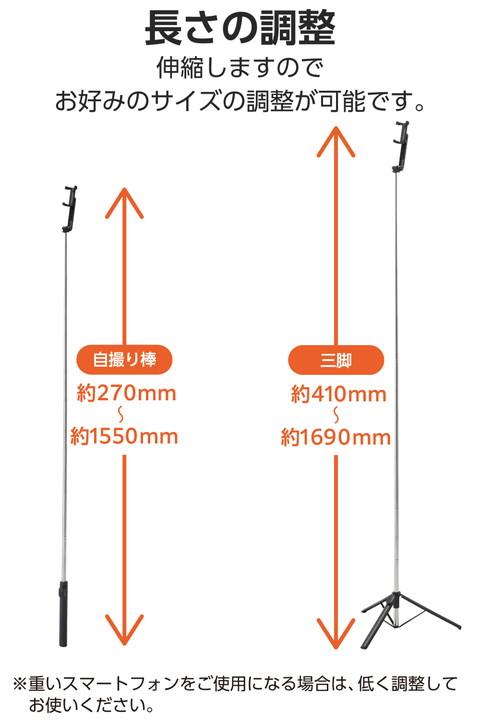 広い場所や全身撮影におすすめ。最大1690mmまで伸びるロングタイプのスマートフォン用三脚です。三脚だけでなく自撮り棒としても使用できる2Wayタイプ。Bluetooth(R)接続で離れた場所からスマートフォンカメラのシャッターを切れるワイヤレスリモコンが付いています。