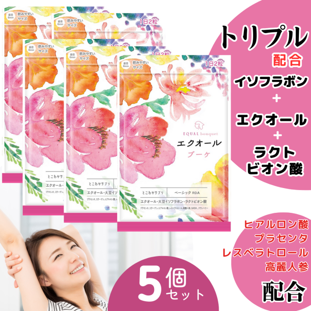 5個セット イソフラボン エクオール ラクトビオン酸 【+7つの副原料】 レスベラトロール ヒアルロン酸 コラーゲン 高麗人参 30日分/60粒 【エクオール ブーケ】 エクオールを直接接取 とこわかサプリベーシックRDA