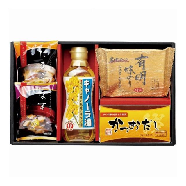 お料理に役立つかつおだしとお湯を注ぐだけで美味しいフリーズドライ味噌汁、白子有明海苔、キャノーラ油の貰って嬉しい詰合せです。