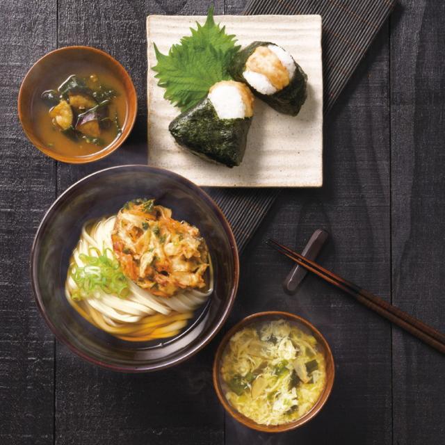 食塩、でん粉、しょう油、たん白加水分解物、酵母エキス、かつお節粉末、こんぶ粉末、うきみ・具(鶏卵(国産)、しいたけ、わかめ、ねぎ)/調味料(アミノ酸等)、酸化防止剤(ビタミンE)、増粘剤(キサンタンガム)、(一部に卵・小麦・大豆を含む)