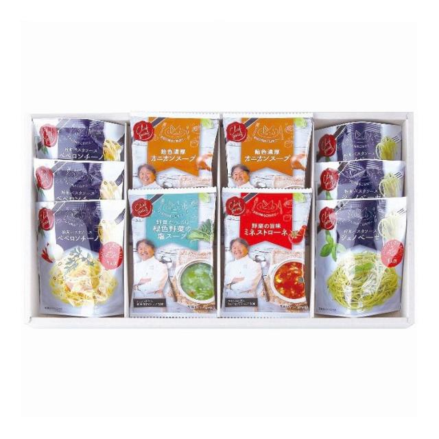 オニオンスープ×2個・ミネストローネ・緑色野菜の塩スープ各1個・粉末パスタソース(ジェノベーゼ・ペペロンチーノ各3個)