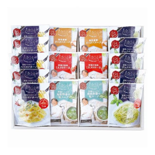 オニオンスープ・ミネストローネ・緑色野菜の塩スープ各2個・粉末パスタソース(ジェノベーゼ・ペペロンチーノ各5個)