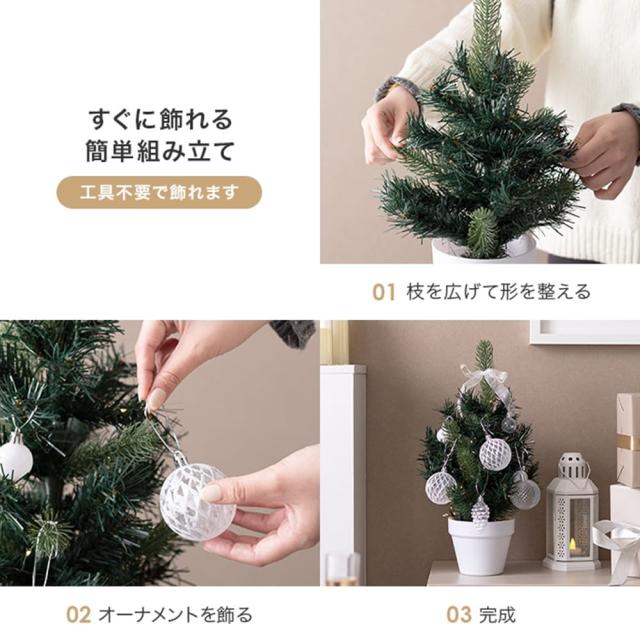 組み立ては工具不要で、枝を広げてオーナメントを飾るだけなので、どなたでも簡単にセット可能です。