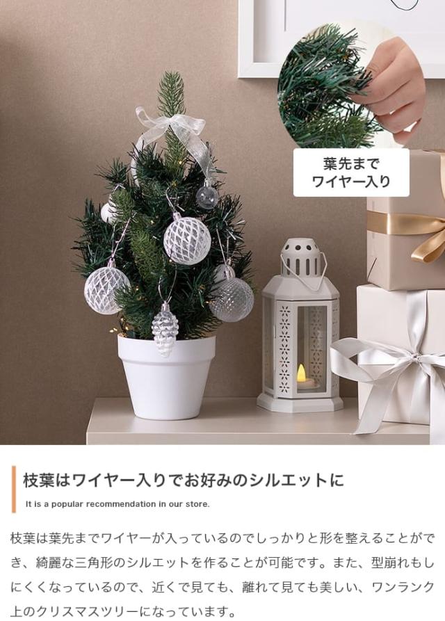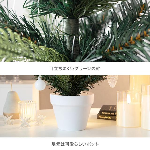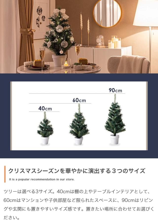 サイズは40cm、60cm、90cmの3種類があり、棚の上や子供部屋など小さなスペースから、リビングのメインツリーとしてもぴったり。