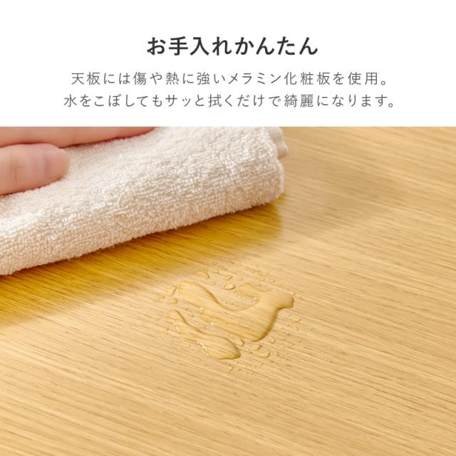 天板には傷や熱に強いメラミン化粧板を使用しており、汚れてもサッと拭くだけで綺麗に保てます。