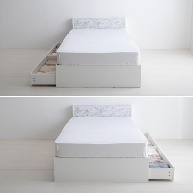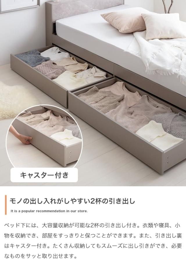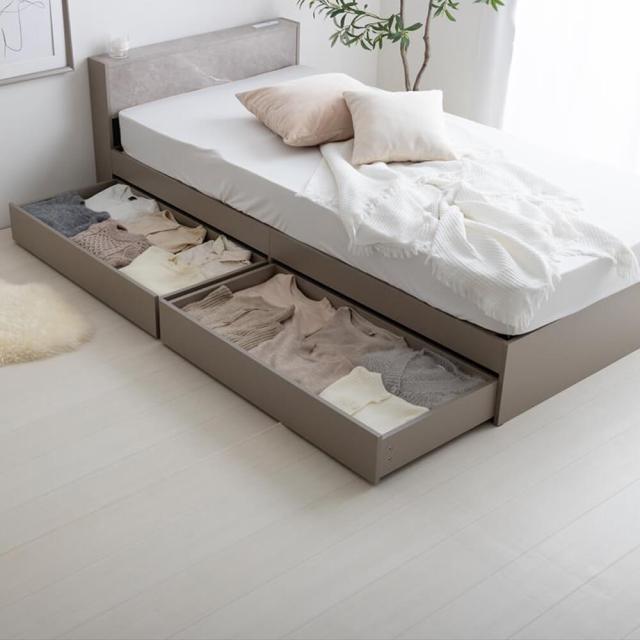 さらに、ベッド下には大容量の引き出しが2杯ついており、衣類や寝具、小物などをすっきり収納可能。