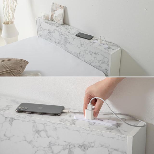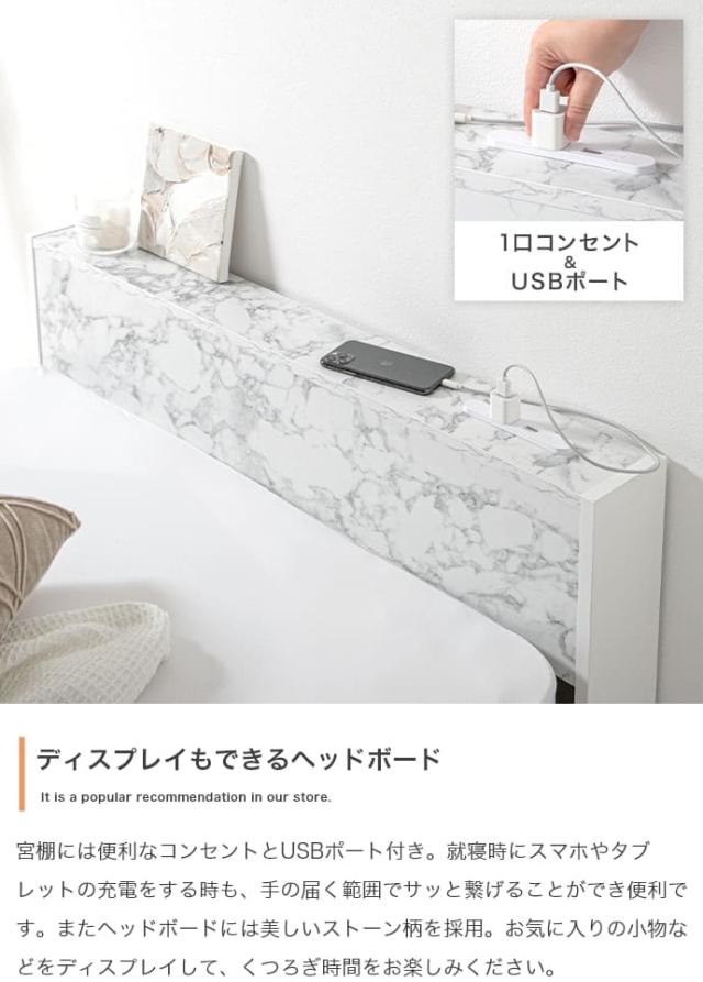 ストーン柄がアクセントの宮棚&コンセント付き収納ベッドは、寝室を高級感あふれる空間に変えてくれますよ♪