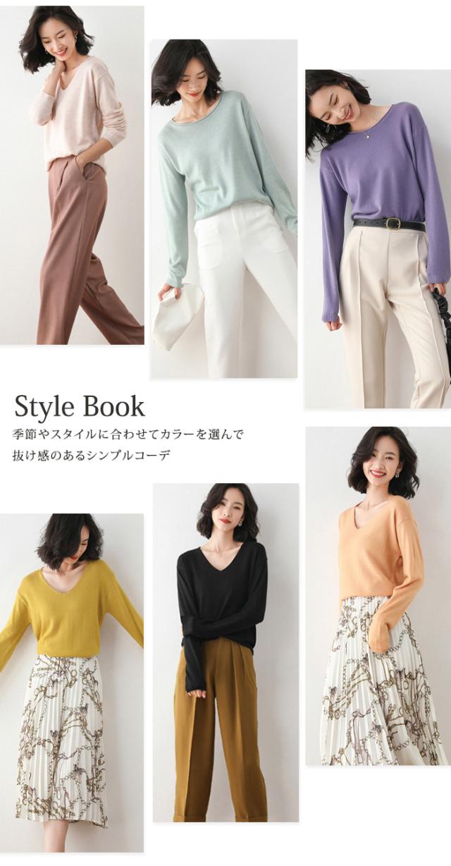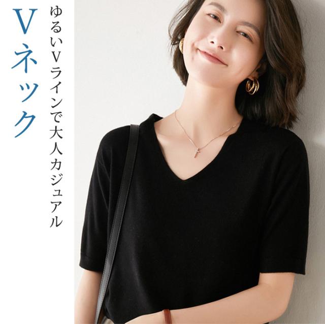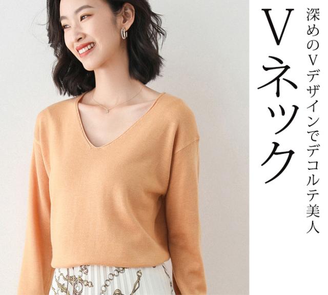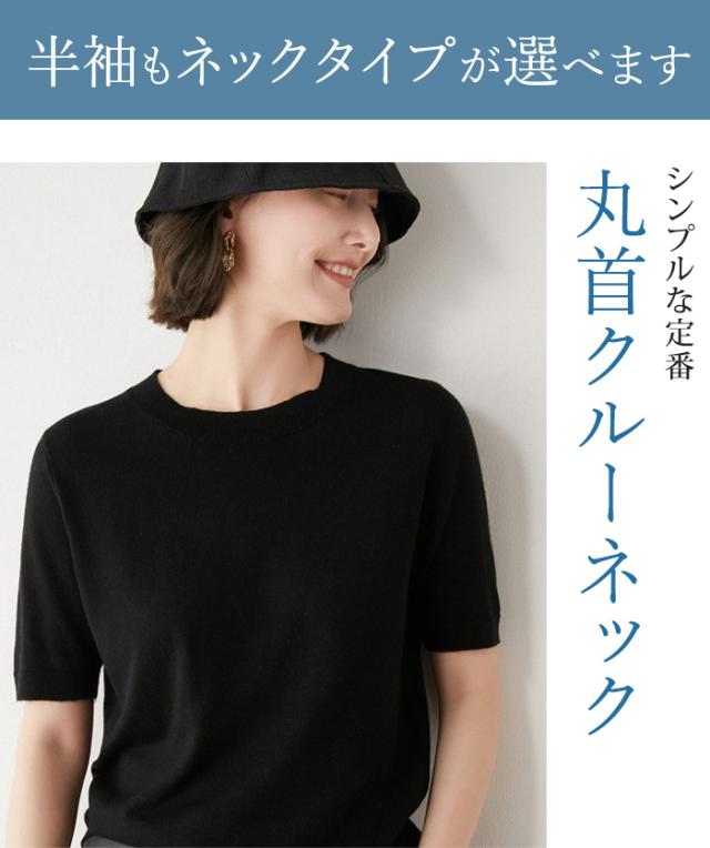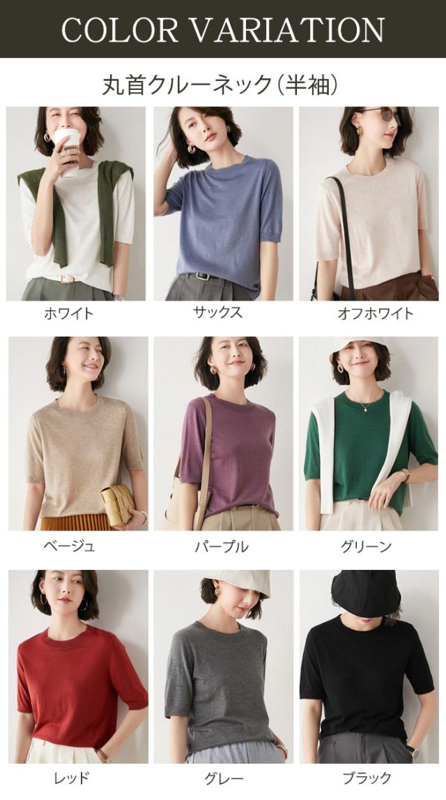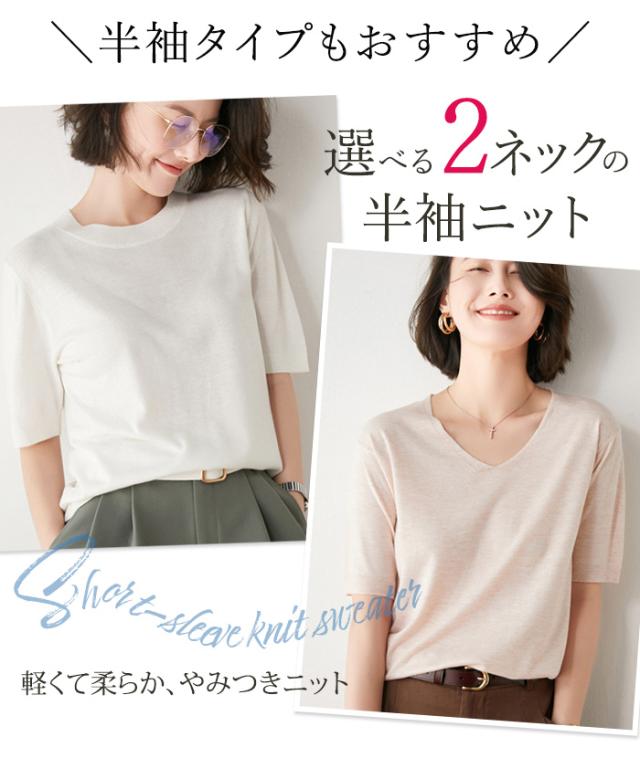 回し力バツグンのシンプルデザインのニットが多色展開で登場! パッと着てさっとオシャレにお出かけできそうな抜 け感のあるシンプルデザイン。 半袖は薄くて軽くて柔らかい着心地の良い素材で、丸首クルーネックとVネックの2タイプからお選びいただけま す。 長袖はしっかり質感を感じられる滑らかな素材感で、丸首ボートネックとVネックの2タイプからお選びいただけます。 ※半袖、長袖ともに2タイプのネックデザインからお選びいただけますが、丸首はクルーとボートでまったく異なりますので、必ず写真でご確認の上ご購入ください。 |