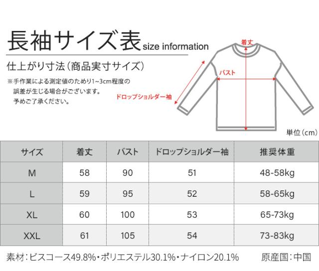ドロップショルダー袖51、推奨体重48-58kg L = 着丈57、バスト95、 ドロップショルダー袖52、推奨体重58-65kg XL = 着丈60、バスト100、 ドロップショルダー袖53、推奨体重65-73kg XXL = 着丈61、バスト105、 ドロップショルダー袖54、推奨体重73-83kg ※手作業による測定値の為、1-3cmの誤差がある場合があります。予めご了承下さいませ。 |