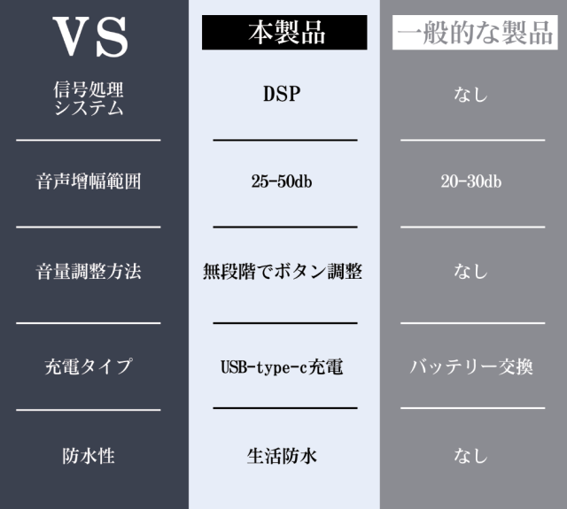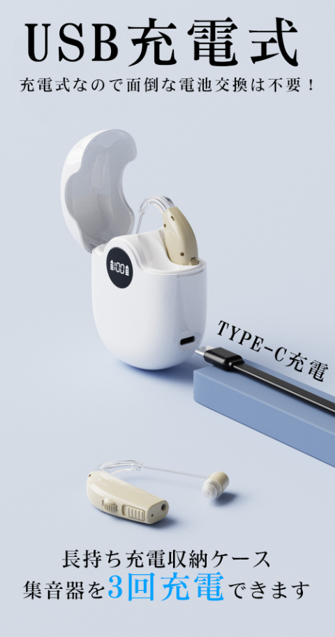 【USB充電式&収納ケース付き】 集音器にはUSBのtype-cケーブルがつきましており、簡単に充電できる利便性に加えて、専用の収納ケースが付属します。100分でケースを充電完成、完成したら三回まで集音器を充電できます。